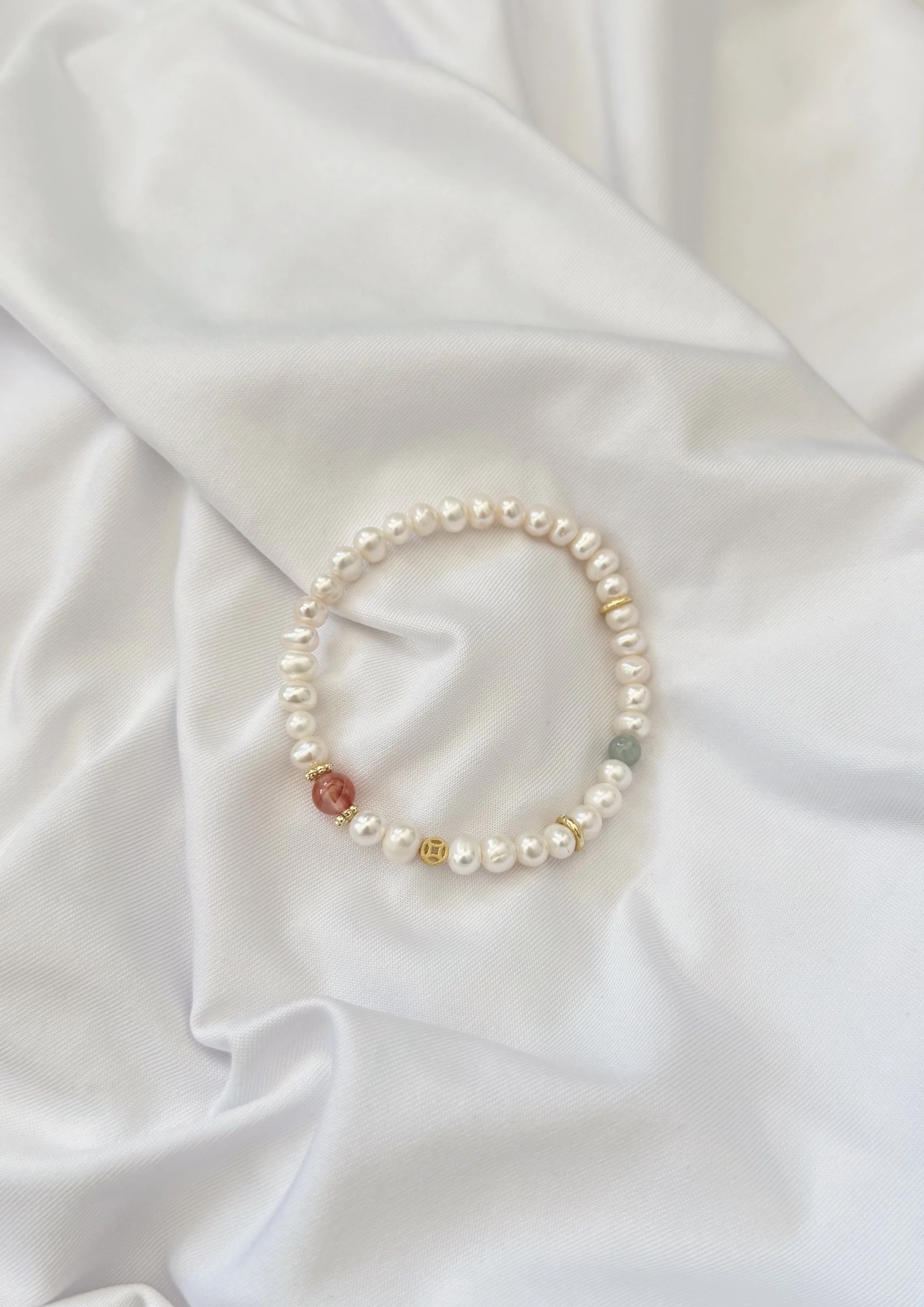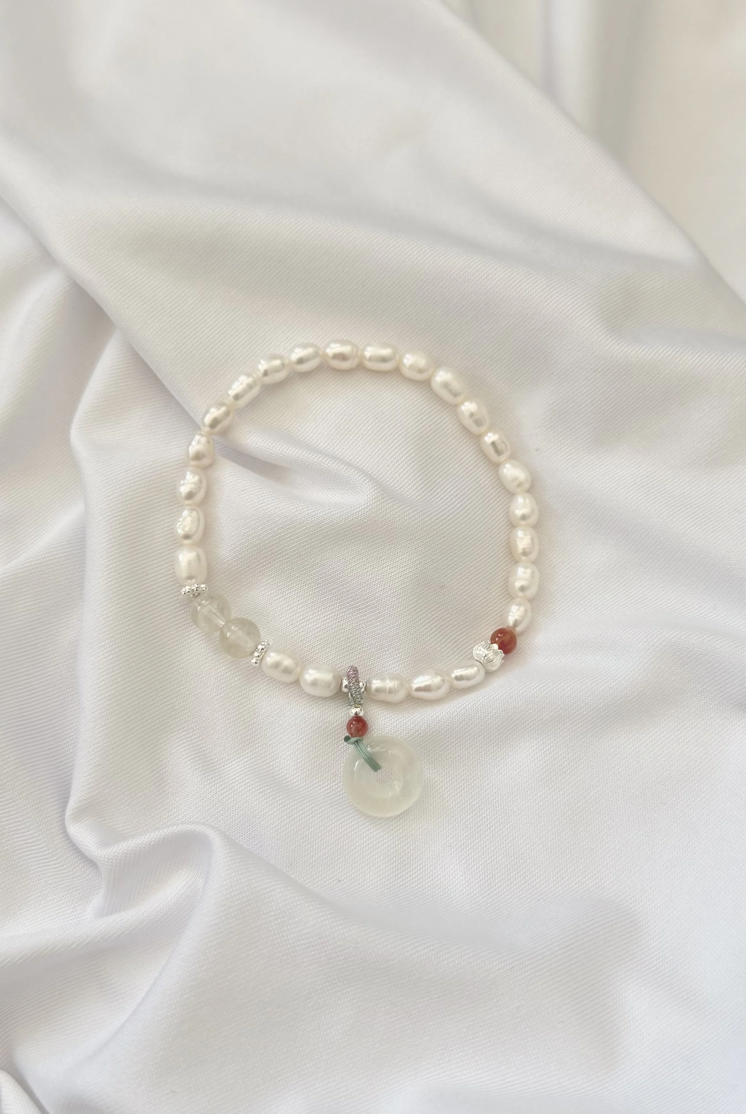 This bracelet combines luminous freshwater pearls with calming jade, creating a graceful balance of elegance and grounding energy. The auspicious cloud charm symbolizes good fortune, happiness, blessings, and the arrival of peace