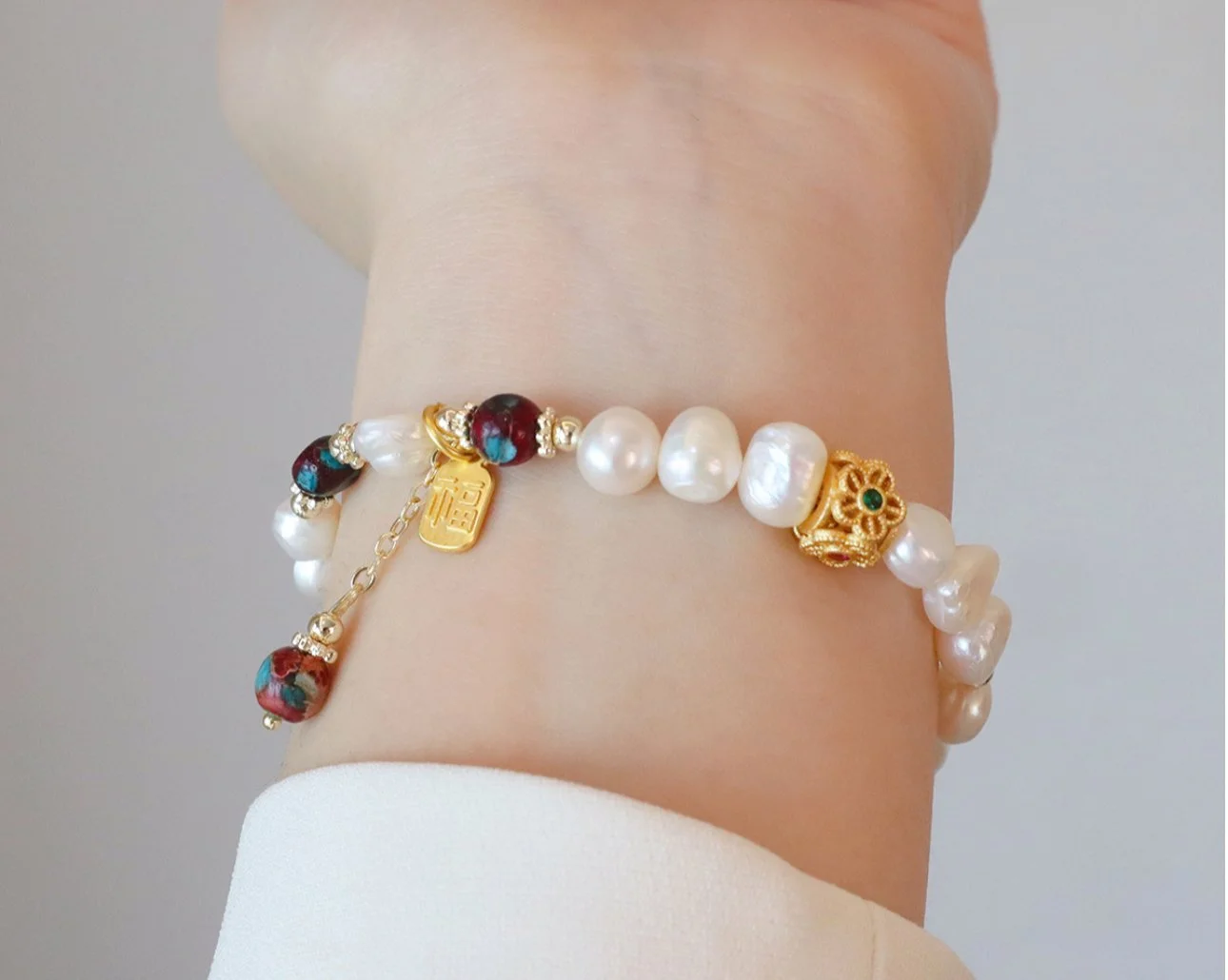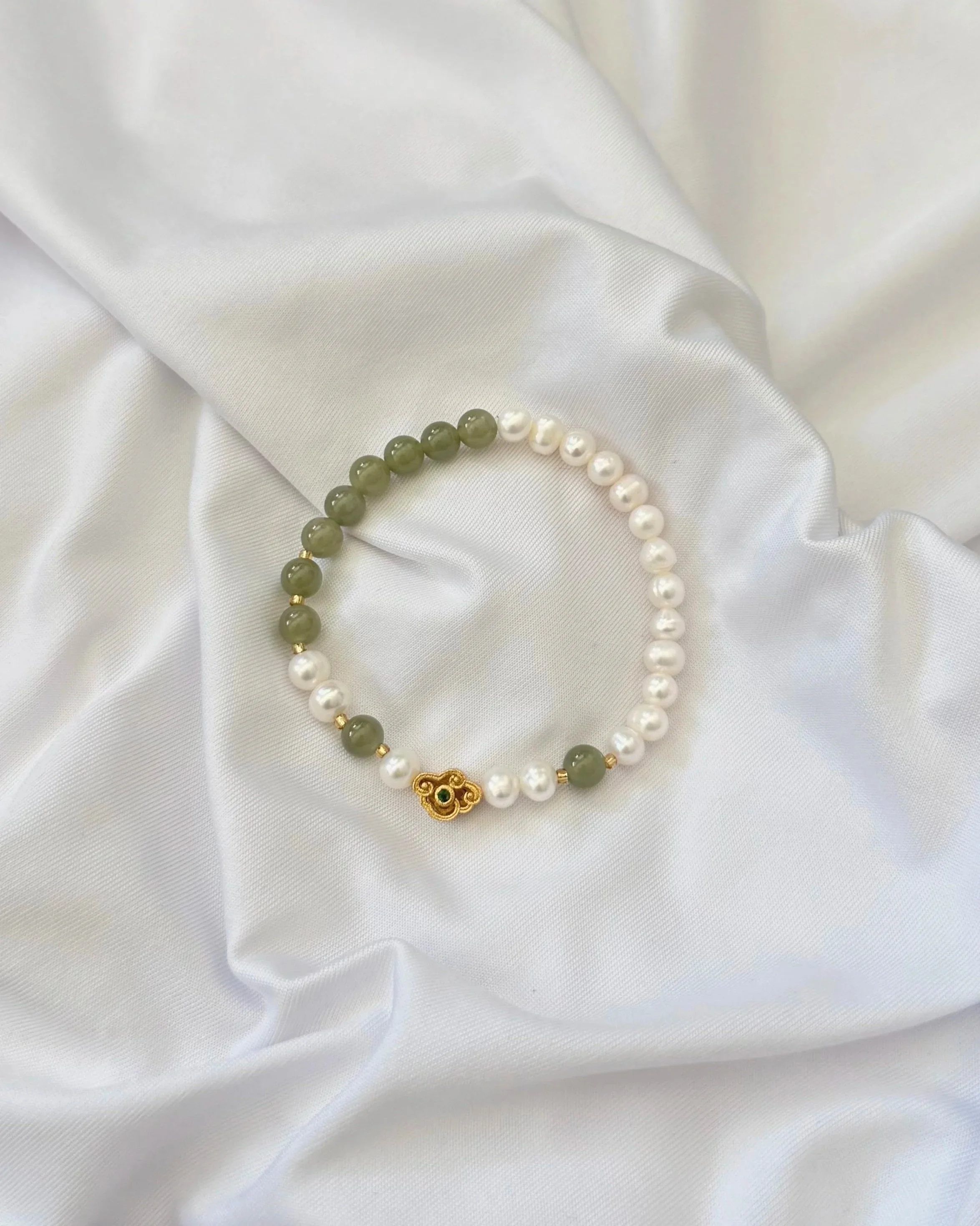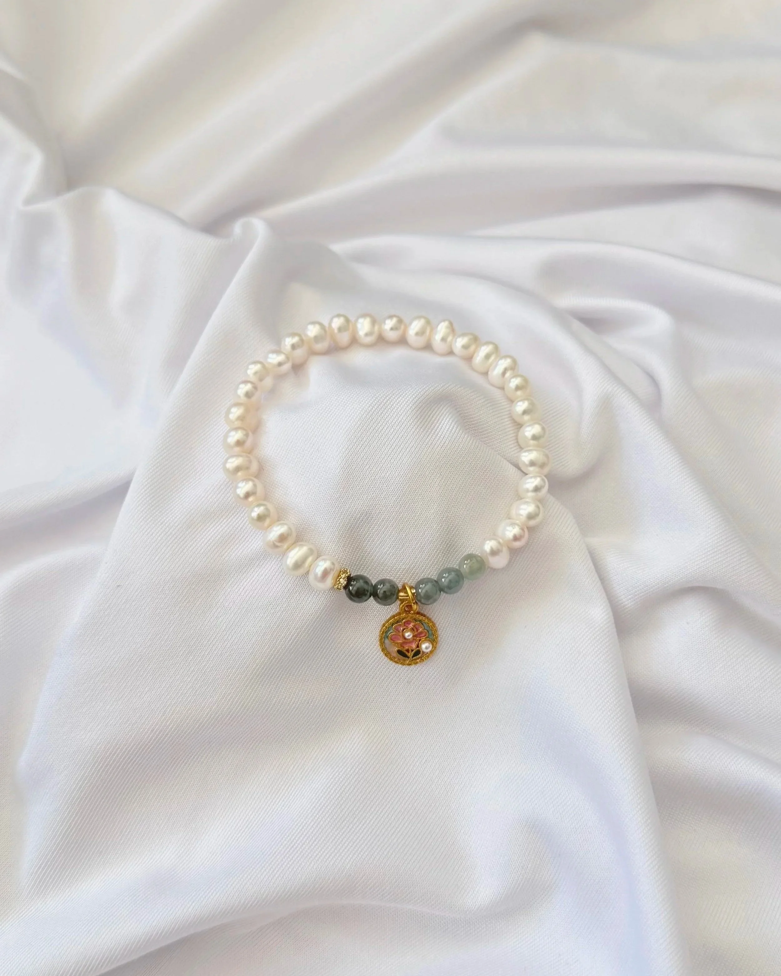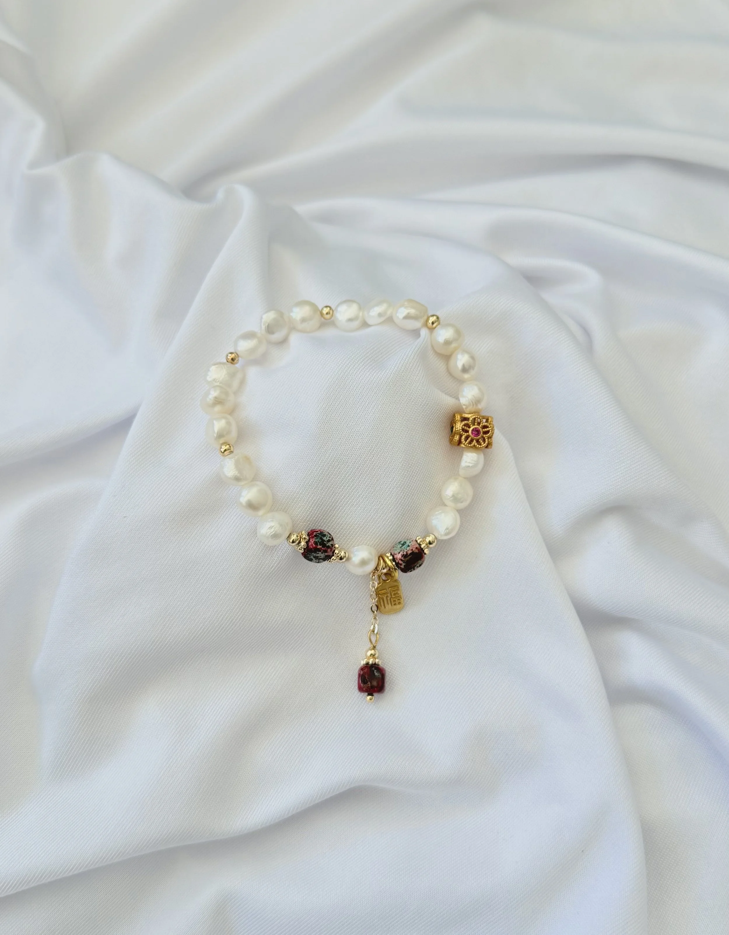 Blending the soft radiance of freshwater pearls with the gentle pink glow of strawberry quartz, creating a harmony of elegance and emotional balance. The centerpiece charm embodies protection and good fortune, believed to ward off negativity, attract prosperity, and bring peace throughout the year.